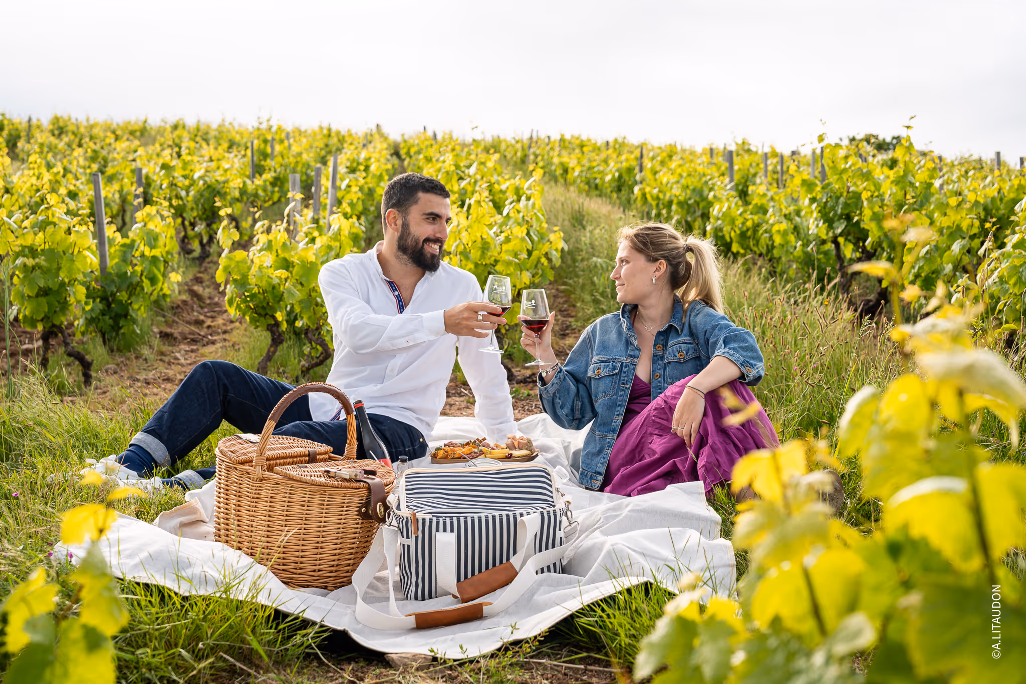 Un moment simple et authentique à partager à deux : panier pique-nique généreux, produits locaux et une bouteille du domaine, face aux vignes.